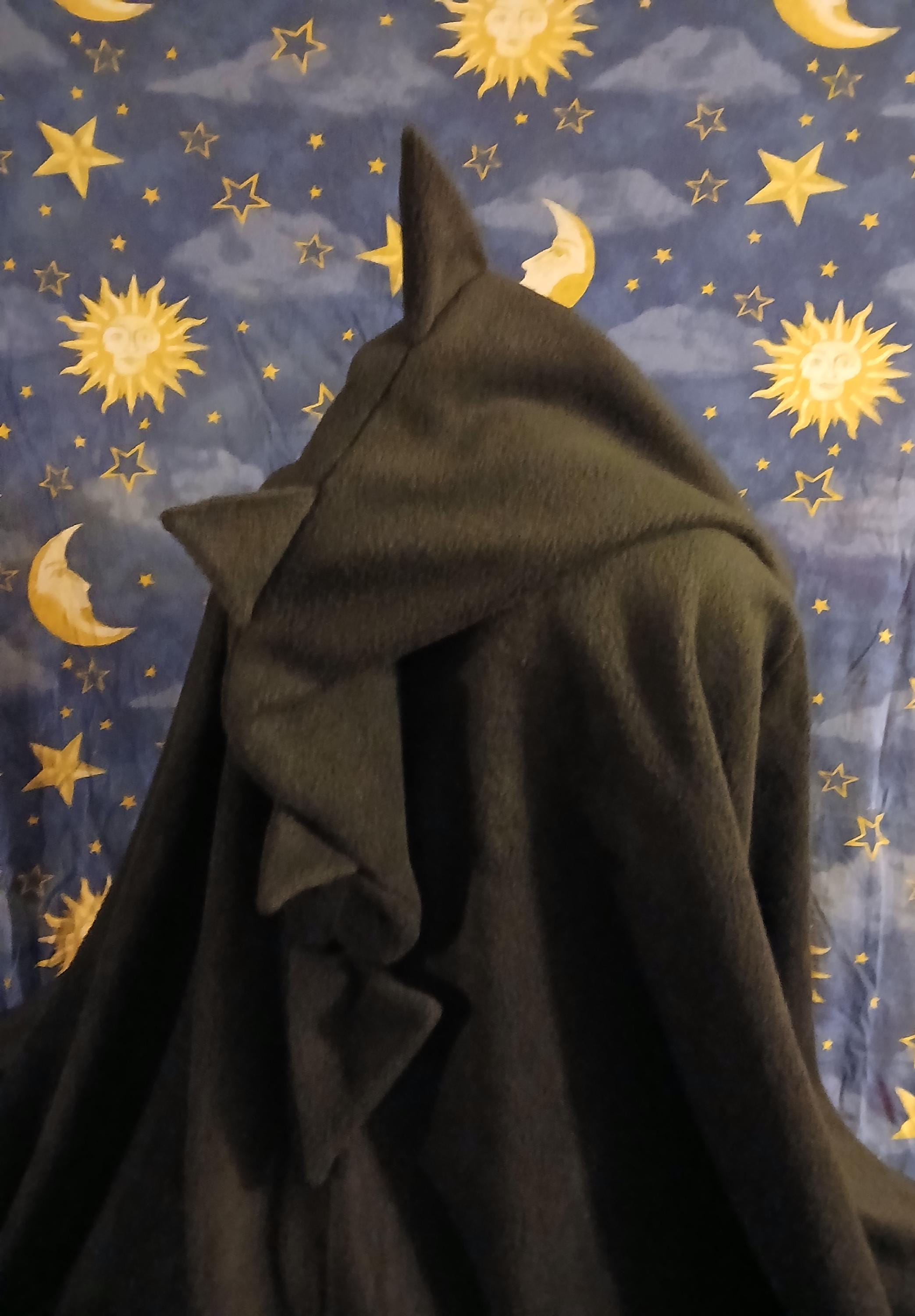 Our Fleece Dragon Tail Hood Cloaks are designed, created, patterned and hand made by the Groovy Moods Team. Each is made from super soft, cozy and comfortable black fleece with Dragon Tail Hoods with spikes and tail tips in your choice of a variety of colors. The tie closures will match the color of the the hood details. Hood details and closures are available in black, purple, blue, green, yellow, orange, pink, red and white.